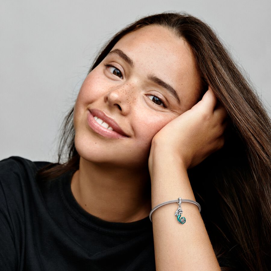 Journey beyond the sea with our Dangle Charm, inspired by the new live-action film adaptation. Celebrate your free spirit and curious heart by adding this sterling silver charm to your collection. ‘s face and locs are brought to life with engraved details, and her mermaid tail shines with hand-applied teal and cerise enamel. A sparkling aurora borealis clear cubic zirconia rests atop the bail, like the sun reflecting on the ocean waves. Keep by your side as a reminder to follow your heart where adventure leads.