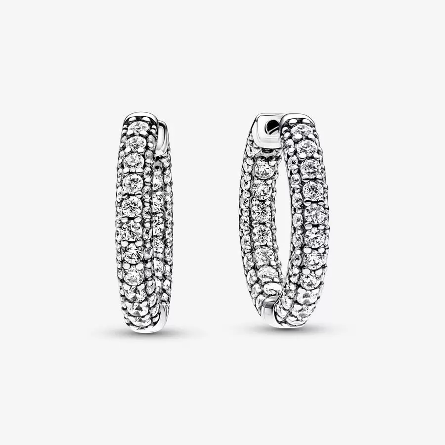 Add a touch of sparkle to your everyday look with our hand-finished Pandora Timeless Pavé Single-row Hoop Earrings. Crafted from sterling silver, the front-facing sides on both the outside and inside of these hoops are lined with one row of clear cubic zirconia down the centre and one down each side, catching the light from every angle. The back of the hoops has a plain polished surface. Style them on their own or with other Timeless Pavé pieces for maximum effect.