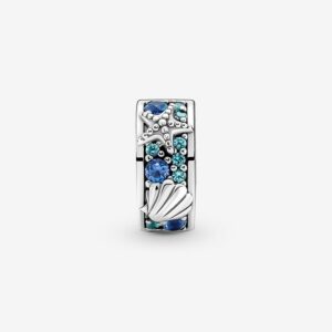 Imagine sunny days in the surf and sand with the Tropical Starfish & Shell Clip Charm. Inspired by treasures found on the beach, it features shells and starfish surrounded by pavé detailing in blue and turquoise man-made crystals to represent the sparkling ocean waves. This clip charm has a silicone grip to hold it in place, meaning it does not fit onto the two threads (raised charm dividers). It can be styled anywhere else on your bracelet for a carefree, beachy vibe.